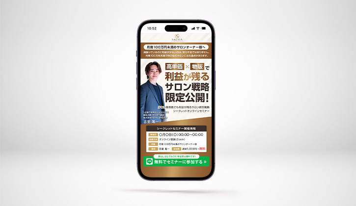 By kagotani / 2026年4月6日 LP SALSIA -LP- 2026-04-06 ターゲット 月商100万円に届かないサロンオーナー。 課題 サービスの作り立てで、認知が無い。 目的 認知度UPのために、無料セミナーへ集客したい。 デザインプロセス Meta広告の使用者に合わせて、スマホ特化のLPで制作することにしました。クライアント様の要望でもある「サロンオーナーが気になる」をベースに儲かる未来像をイメージさせるゴールドの配色を使い、誰がセミナーをするのかを顔出しで見せることで信頼感を演出しています。文字は自然な目線誘導先に配置しました。 制作期間 企画 / 情報設計 / WFライティングデザインコーディング 1週間1週間1週間3日 使用ツール Photoshop / VSCode